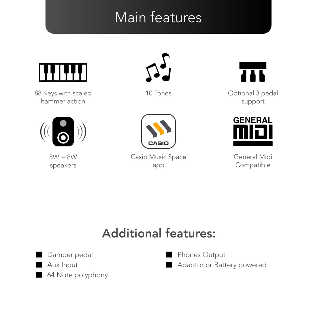 Casio CDP-S160BK (KP79) | Digital Piano with 88 Hammer Action Keys | Midi Support and Headphone Jack | Black