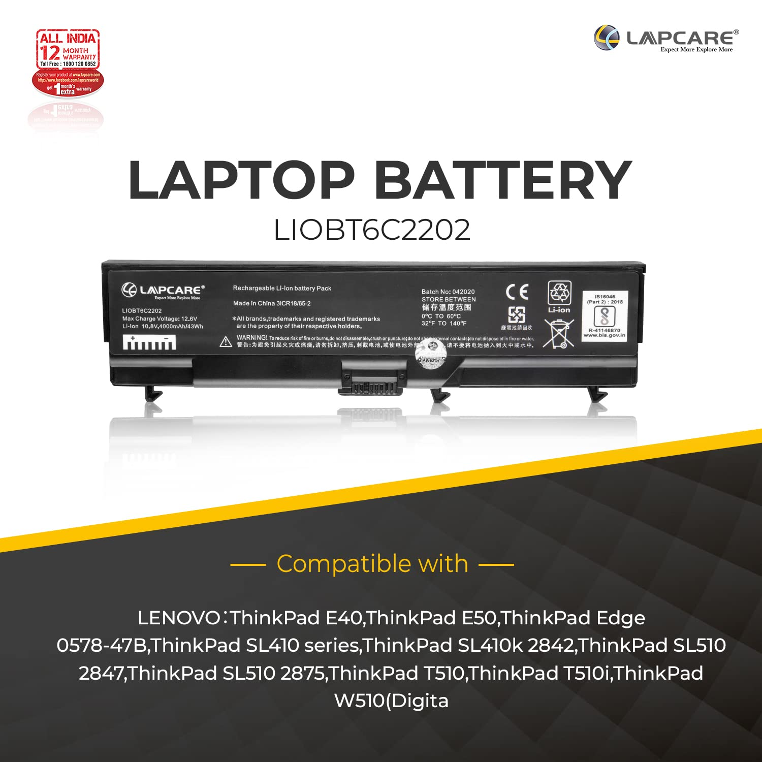 Lapcare BIS Certified Compatible Laptop Battery for Lenovo Thinkpad T410/SL410/SL510 Series 6 Cell