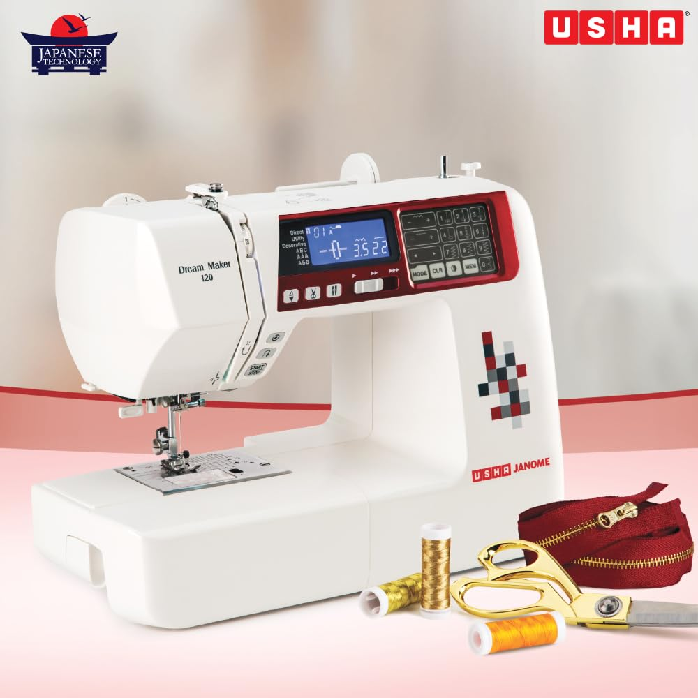 Usha Janome Dream Maker 120 Automatic Zig-Zag Computerized Sewing Machine || 120 Built-In-Stitches(White) With complementary Sewing Lessons in Nine languages